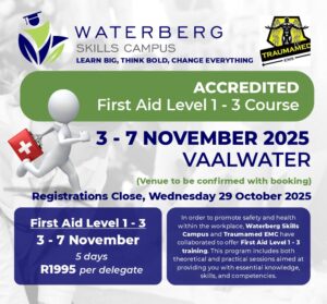 In order to promote safety and health within the workplace, Waterberg Skills Campus and Traumamed EMC have collaborated to offer First Aid Level 1 training. This program includes both theoretical and practical sessions aimed at providing you with essential knowledge, skills, and competencies.